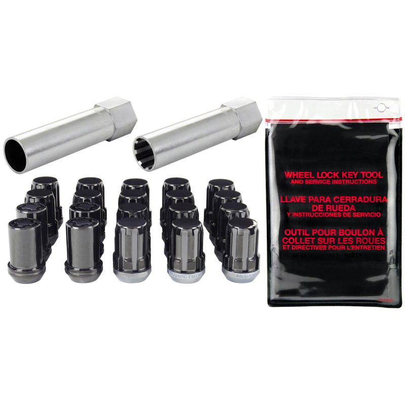 The convenient way to order Tuner wheel locks and lug nuts; contains all the hardware that you need to install 4 wheels and tires.; Why settle for ordinary lug nuts? SplineDrive Lug Nuts combine style and performance.; A no-compromise design engineered to fit small diameter recesses in Tuner style wheels.; SplineDrive lug nuts offer closed-end design, maximum gripping power, more stud engagement and a greater seating surface than socket style lug nuts.; In addition they are 30% lighter in weight.; Like all McGard lug nuts, the chrome with black PVD plating is guaranteed for life not to rust, chip or peel.; The easy-to-use, one-piece wheel locks function like regular lug nuts, but require a special key tool for installation and removal.; The computer generated key designs allow for an infinite number of key patterns.; McGard manufactures wheel locks and lug nuts in the USA to meet or exceed O.E.M.; standards for safety and durability.; Every lug nut and wheel lock is fully machined from restricted chemistry steel made specifically for McGard and through-hardened for its unsurpassed level of safety.; For use on aluminum cone seat wheels only.; This product may contain globally sourced materials/components.
